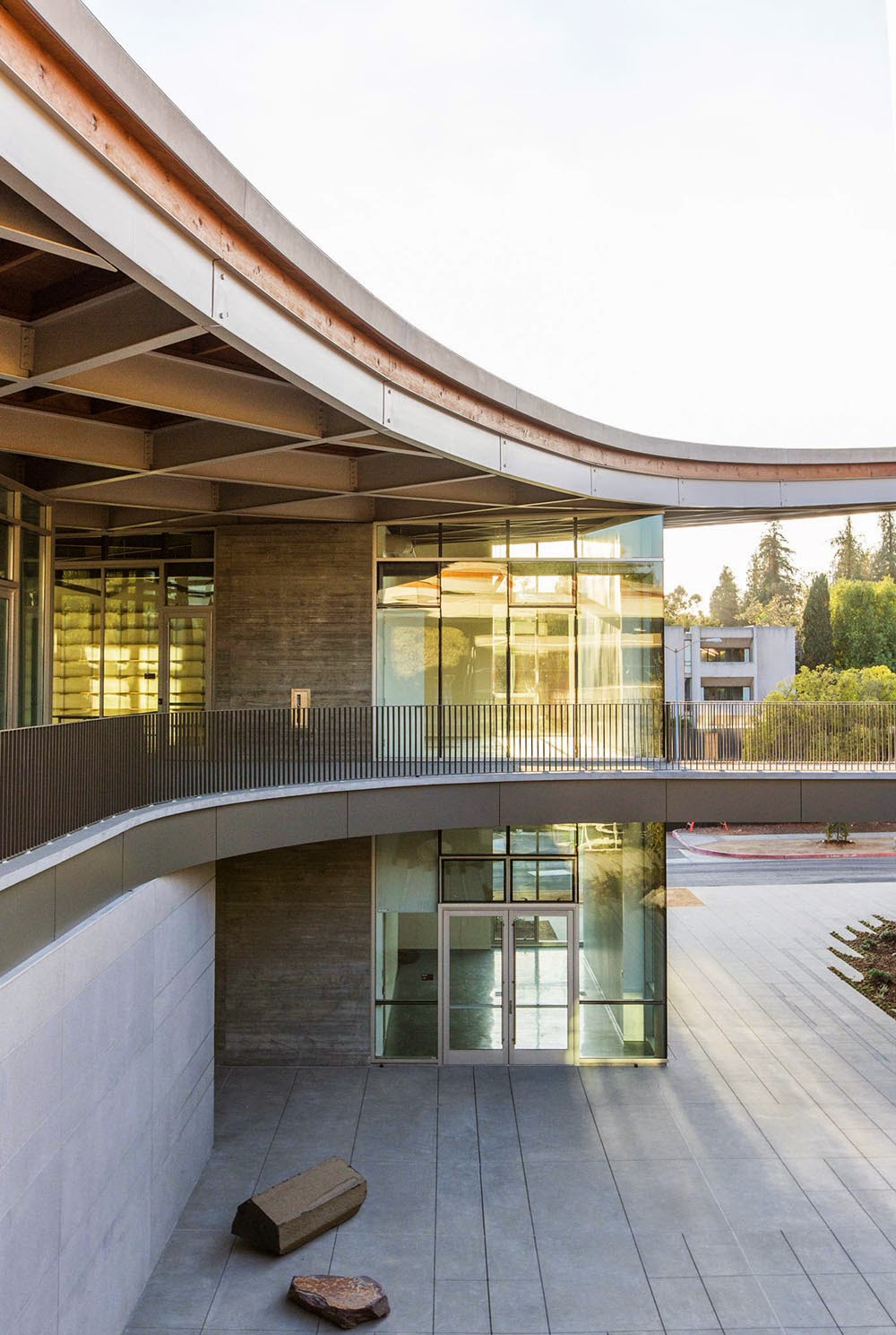 Designed by the award-winning Kulapat Yantrasast of wHY Architecture, the two-story edifice is highlighted by a soaring wood-beam roofline which mimics the slopes of the nearby San Gabriel Mountains. The Studio Art Hall is based on a village model, with a layout that is structured to maximize interactions between students, faculty and staff as they move through studios and public space. Floor-to-ceiling glass walls further emphasize this transparent, collaborative atmosphere, while also providing the building's interior with natural light and panoramic views of the surrounding campus.